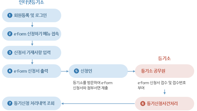 e-Form 신청(전자표준양식)은 전자적으로 등기신청정보를 입력 및 저장할 수 있는 표준화된 등기신청서 양식으로서 "인터넷등기소"에서 편리하게 작성하실 수 있다. 작성한 등기신청서는 출력하여 날인한 후 첨부 서류들과 함께 등기소에 제출하면 된다.