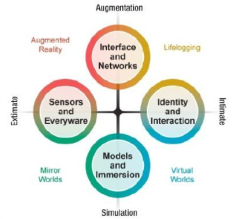 - 증강 현실 (Augmented Reality) : 현실 위에 가상의 이미지, 신기한 물건, 판타지적 세계관이나 이야기 등을 덧씌워 만든 세계. 증강현실의 시작은 스마트폰, 컴퓨터 등을 통해 보는 현실의 모습 위에 가상의 물체나 이미지를 입혀서 보고 상호작용하는 방식