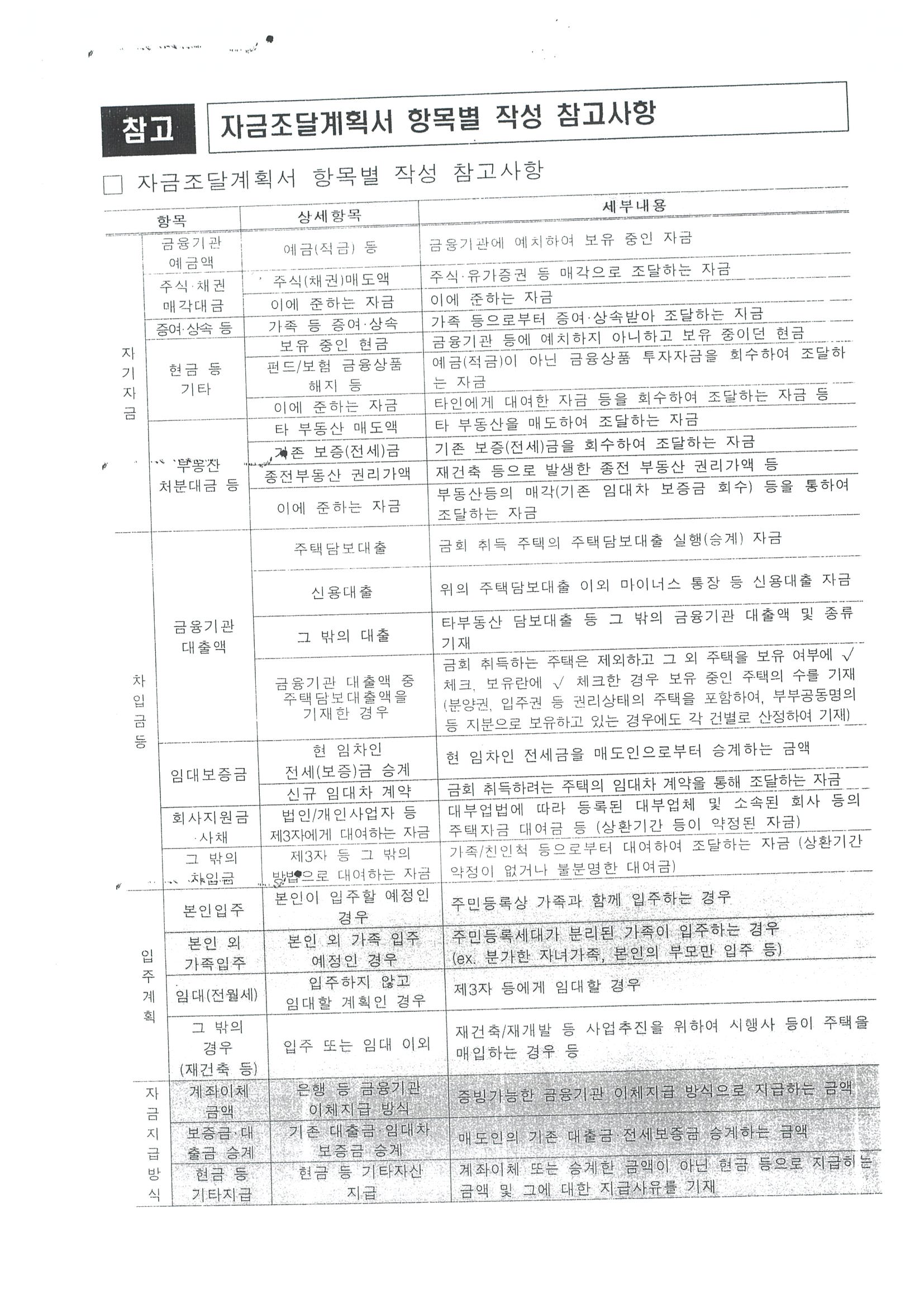 - 이 경우 주택취금자금 조달 및 입주계획서의 제출일을 기준으로 주택취득에 필요한 자금의 대출이 실행되지 않았거나 본인 소유 부동산의 매매계약이 체결되지 않은 경우 등 항목별 금액 증명이 어려운 경우에는 그 사유서를 첨부해야 함