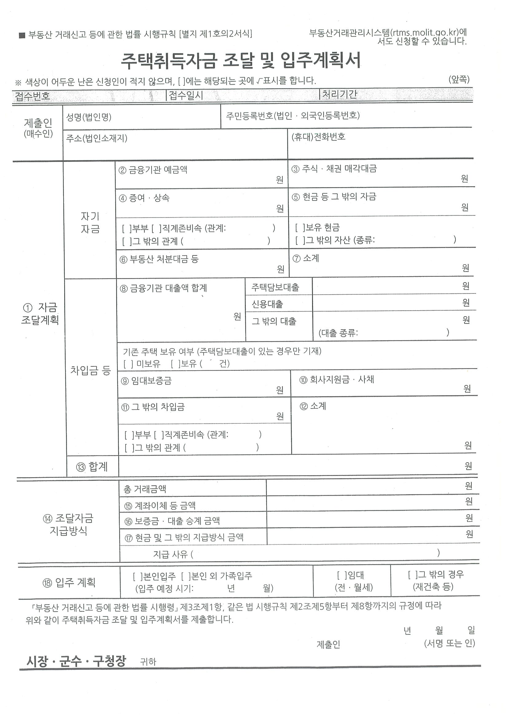 - 부동산거래신고 등에 관한 법률 시행규칙상 주택취급자금 조달과 입주계획을 제출하기 위한 양식으로 자금 조달계획과 조달자금 지급방식 및 입주계획 등의 내용을 기재하여 작성하는 주택취급자금 조달 및 입주계획서 양식