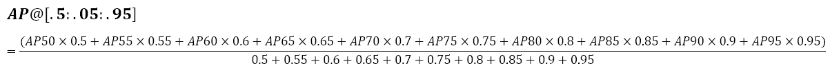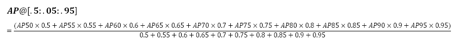 - 이후 이 class에 대한 AP@IoU=0.55~0.95를 구하고, 동일하게 AP@IoU=0.55~0.95를 구하여, AP@[.5: .05: .95]를 구할 수 있음