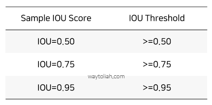 객체 검출의 정확도를 평가하는 지표. 일반적으로 Object Detection에서 개별 객체(Object)에 대한 검출(Detection)이 성공하였는지를 결정하는 지표로 0~1 사이의 값을 가짐