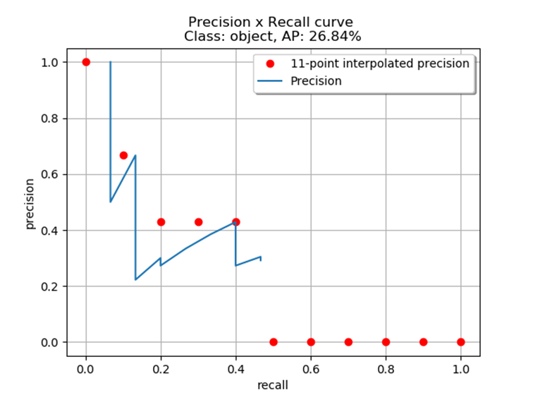 - 2010년부터, PASCAL VOC 챌린지에서 AP 계산 방식이 변경되어, 현재는 11점 보간법(11-point interpolation) 뿐만 아니라 모든 점 보간법(interpolating all data)을 사용함