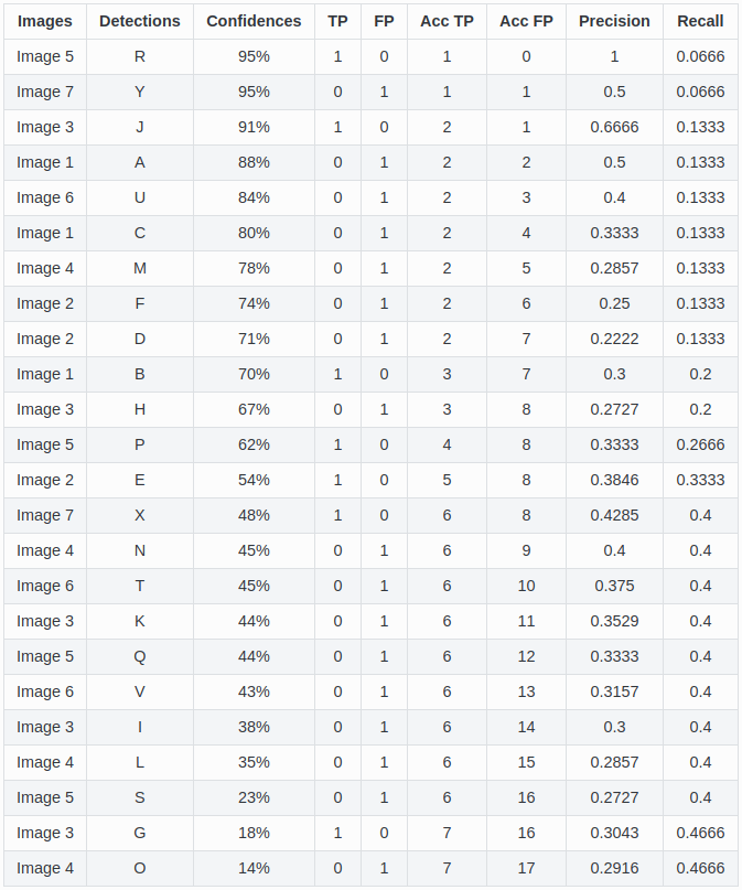 일부 이미지는 ground truth와 겹치는 이미지가 1개 이상임(이미지 2,3,4,5,6,7). 이러한 경우 첫번째 detection은 TP로 간주, 나머지는 FP로 간주
