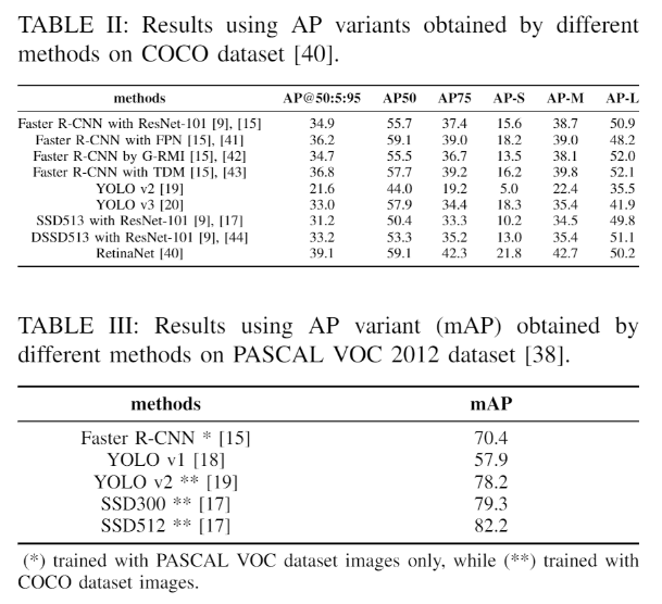- 아래는 COCO 데이터셋과 PASCAL VOC 2012 데이터셋 기반 모델 성능 비교를 위해 AP와 mAP 계산 결과