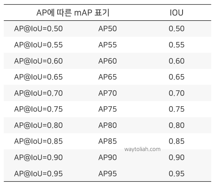 - IOU의 threshold 값은 각각 다른 AP 지표를 제공하므로 사용되는 threshold를 항상 표시해야 함