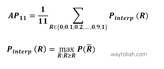 - 2010년부터, PASCAL VOC 챌린지에서 AP 계산 방식이 변경되어, 현재는 11점 보간법(11-point interpolation) 뿐만 아니라 모든 점 보간법(interpolating all data)을 사용함