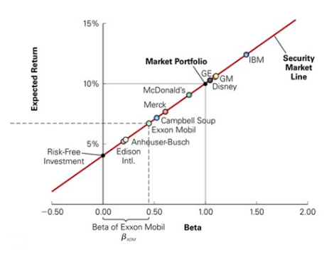 - CAPM에 따르면, 균형 하에서 개별 자산(또는 포트폴리오)의 기대수익률이 그 자산의 체계적 위험의 지표인 베타계수와 선형적 관계를 가지고 있는데, 이러한 관계를 증권시장선(SML)이라 한다.