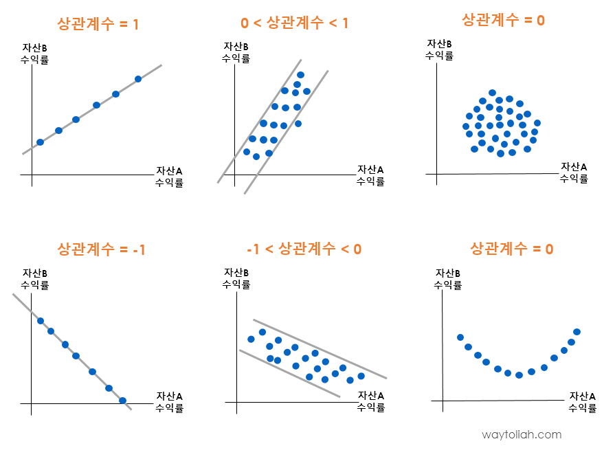 - 공분산이 양의 값이라면 두 자산수익률이 평균적으로 같은 방향으로 움직이고, 공분산이 음의 값이라면 두 자산수익률이 평균적으로 다른 방향으로 움직임을 의미