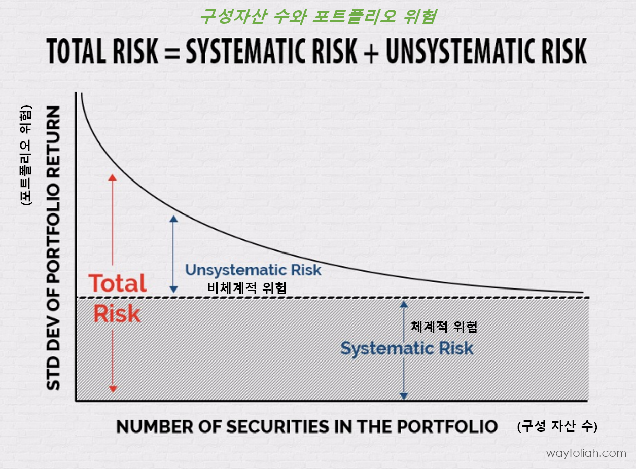 - 따라서 구성자산의 수가 많을수록 위험분산효과는 커지게 됨