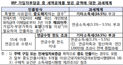 단, 중도해지 시 "세제혜택 받은 납입금액 + 운용수익" 전체에 대해 16.5% 세율을 적용한 기타소득세(지방소득세 포함)을 부담해야 함.