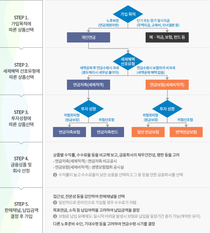 - 가입목적에 따른 상품 선택 : 노후보장 → 개인연금 (or 단기/장기 일시자금 → 예금/펀드 등)