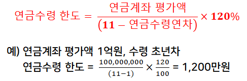 - 연금수령 한도 : 연금계좌 평가액 / (11- 연금수령연차) × (120/100)