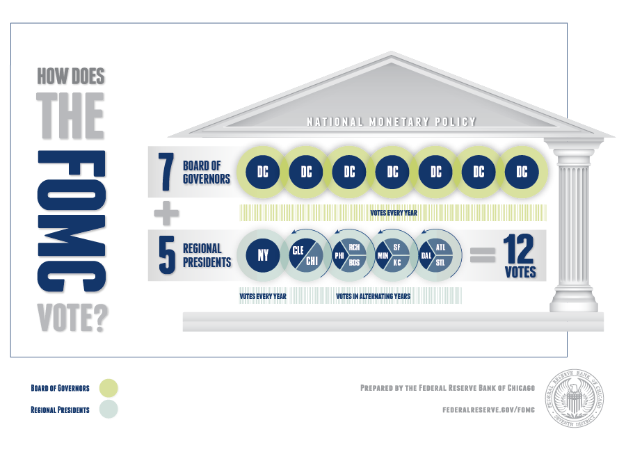 연준 이사 7명과 연방준비은행 총재 5명이 참여하여 투표한다.