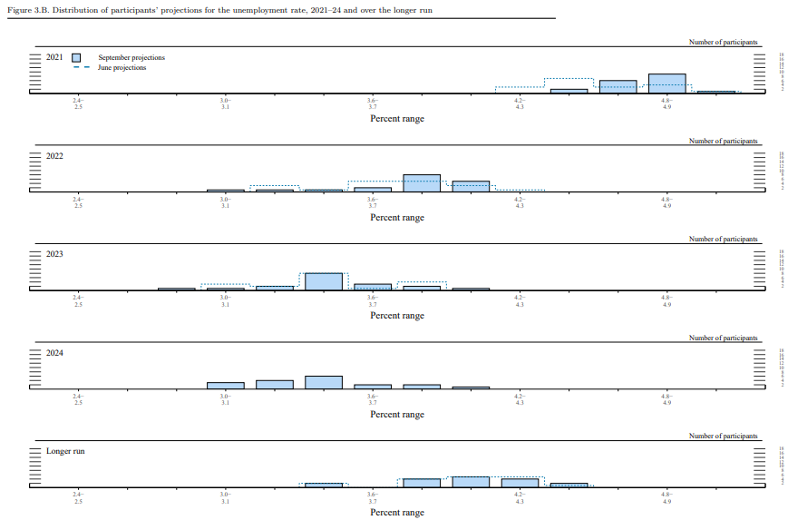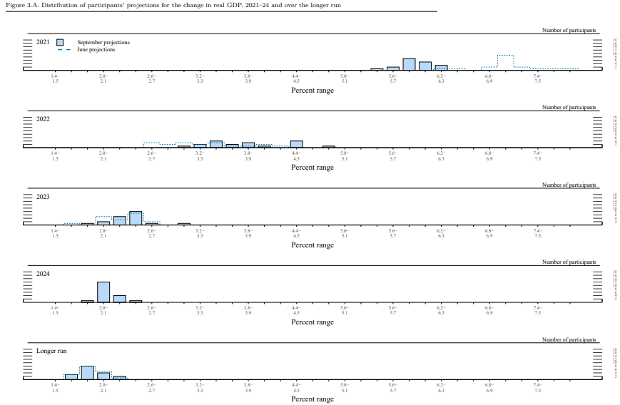2021년 9월 21~22일까지 열린 연방공개시장위원회(FOMC) 회의에서, 위원회 멤버들은 2021년부터 2024년까지 그리고 장기적인 국내총생산(GDP) 성장률, 실업률, 인플레이션에 대한 전망을 공개했습니다. 각 멤버들은, 적절한 통화 정책 및 경제적 영향력 있는 요인들에 대해 회의 당시 이용할 수 있는 정보를 기반으로 예측치를 산정했습니다. 지표별 장기 전망은 적절한 통화 정책 하에서 추가적인 경제적 충격이 없다는 가정 하에 각 멤버들의 평가가 반영된 것입니다. FOMC 멤버들이 경제활동과 인플레이션에 대한 본인의 권한 내에서 해석한 것을 바탕으로, 완전 고용과 물가 안정 목표 달성 확률이 가장 높은 방향으로 "적정 통화 정책(Appropriate monetary policy)"이 정해질 것입니다.