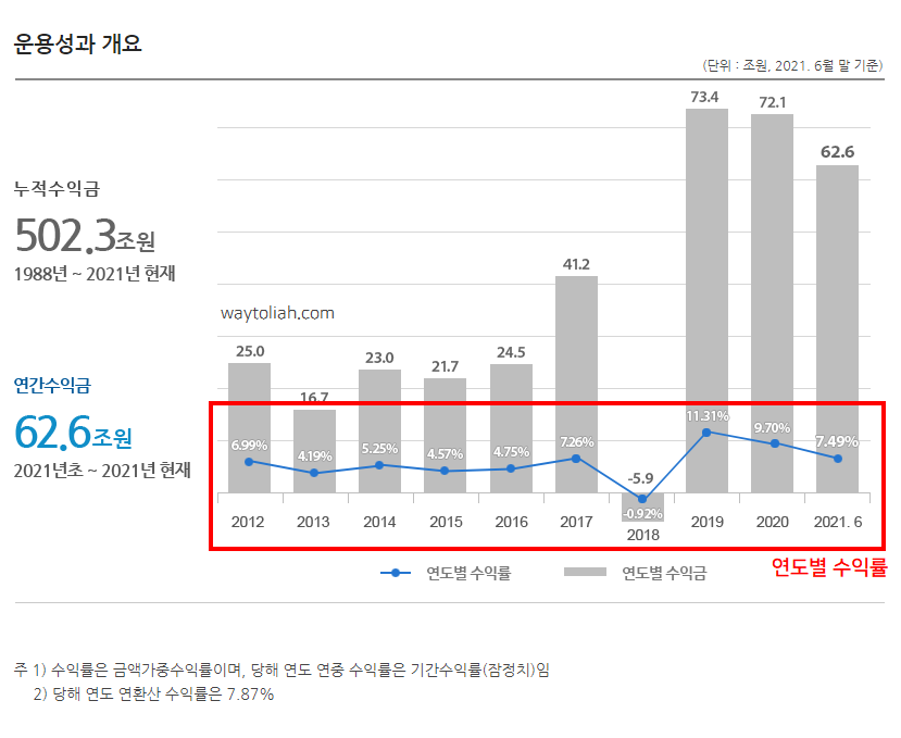 | 연도 | 연도 수익률 (%) | 연도 수익금 (조원) | 누적 수익금 (조원) |