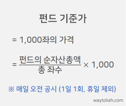 - 펀드 기준가 계산 = 해당 펀드 1,000좌의 가격 (현재 시점에서 펀드 1,000좌를 살 수 있는 가격)