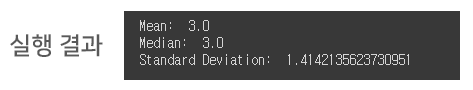 - 평균(Mean), 중앙값(Medain), 표준 평차(Standard deviation) 등