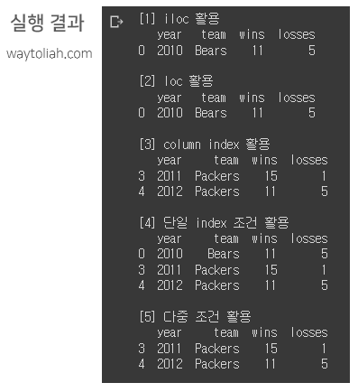 - 행방향 데이터(Index) 조회 : iloc, loc, column index, 단일 index 조건, 다중 조건 활용