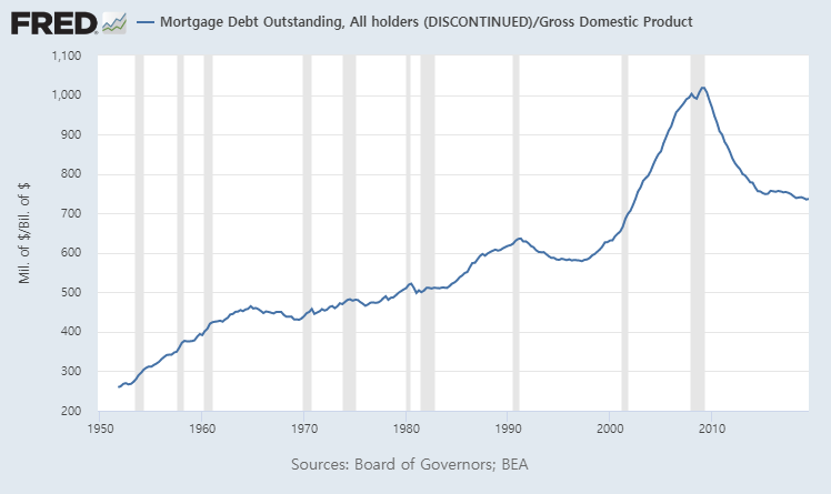 - 정부의 금융정책 완화 : 은행은 기업 뿐만 아니라 일반 개인에게도 막대한 돈을 풀게 됨 (예: 50년짜리 초장기 담보대출, 2세대에 걸쳐 대출금을 갚아도 되는 2세대론 등장 등)