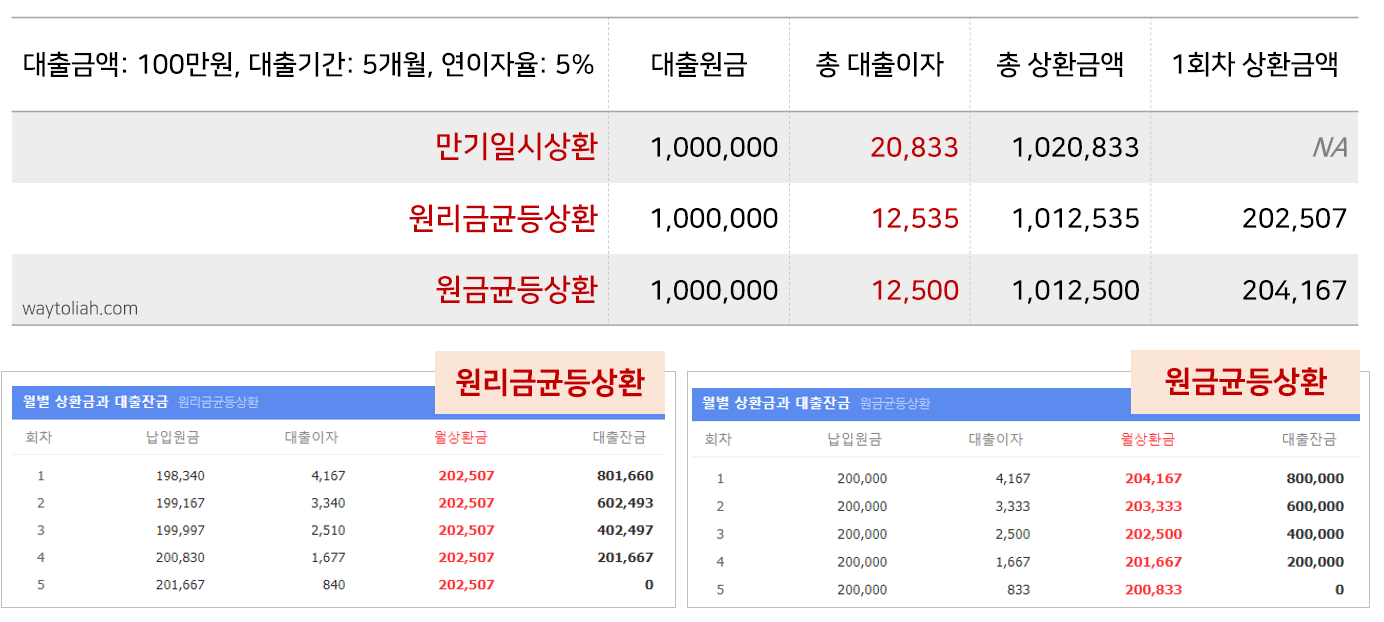 - 예) 100만원을 이자율5%로 5개월 동안 대출한 경우 이자금액 비교