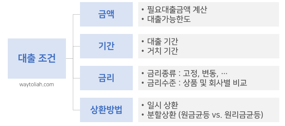- 원금균등상환 : 총 대출이자가 적음. 매달 갚는 금액이 다르므로 돈을 철저하게 관리해야 함