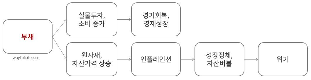 - 부채의 증가, 즉 유동성의 증가는 투자 및 소비의 증가로 이어져 경제성장에 도움이 되기도 함