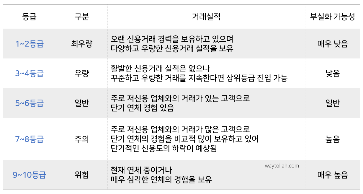 - 개인신용등급은 상환이력정보, 현재부채수준, 신용거래기간, 신용형태정보 등을 고려하여 1~10등급으로 분류