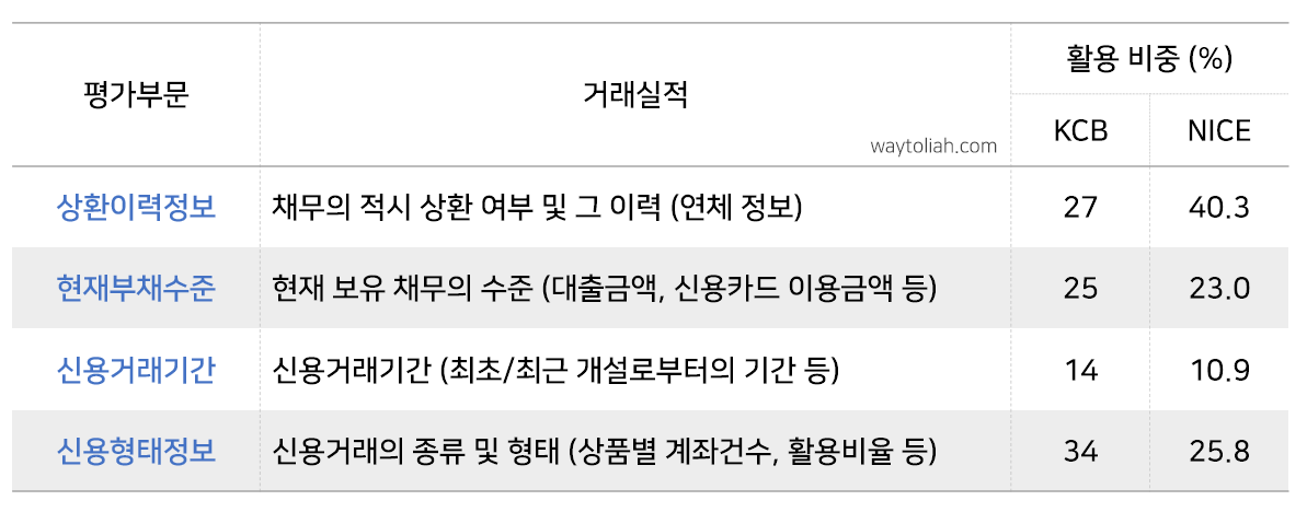 - 개인신용등급은 신용조회마다 평가 비중의 차이가 있음