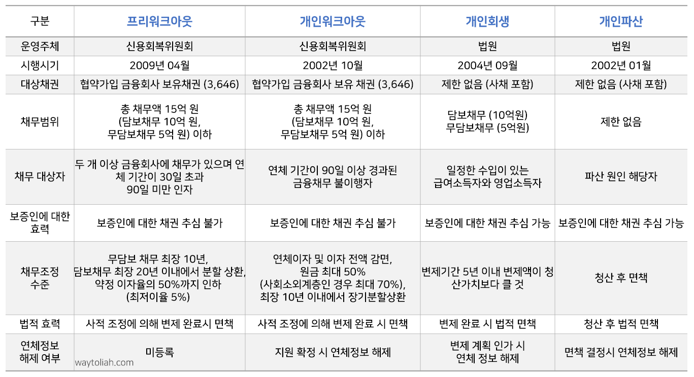 | 구분 | 프리워크아웃 | 개인워크아웃 | 개인회생 | 개인파산 |