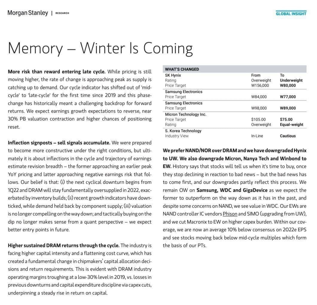 모건 스탠리의 메모리 산업 분석, Memory - Winter is Coming (출처 : Mogan Stanley Research)