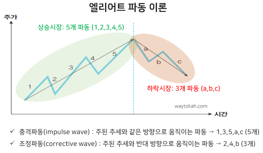 - 엘리엇파동이론은 험적으로 주가가 규칙적인 파동을 가지고 있음을 보여준다. 주가가 상승추세선을 이루는 5개의 파동과 하락추세선을 이루는 3개의 파동이 사이클을 이루어 반복하며, 상승추세에서는 3개의 충격파동과 2개의 조정파동으로, 하락추세에서는 2개의 충격파동과 1개의 조정파동으로 구성된다. 주가변동을 예측하는 기법으로 사용된다.
