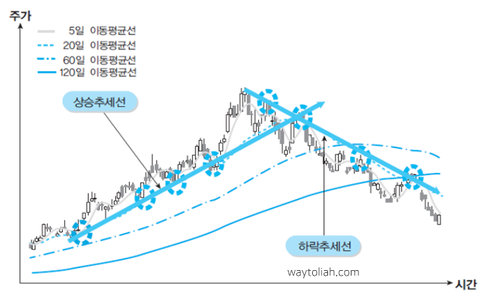일정 기간 동안의 평균적인 주가 흐름을 확인하고, 이것이 현재 주가의 진행방향과 어떤 관계가 있는지를 분석함으로써 미래의 주가 움직임을 예측하는 방법
