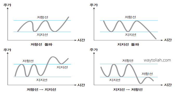 - 기존의 저항선 및 지지선 돌파시 추세 전환의 신호로 볼 수 있음 (기존의 저항선은 지지선, 기존의 지지선은 저항선의 역할을 함)