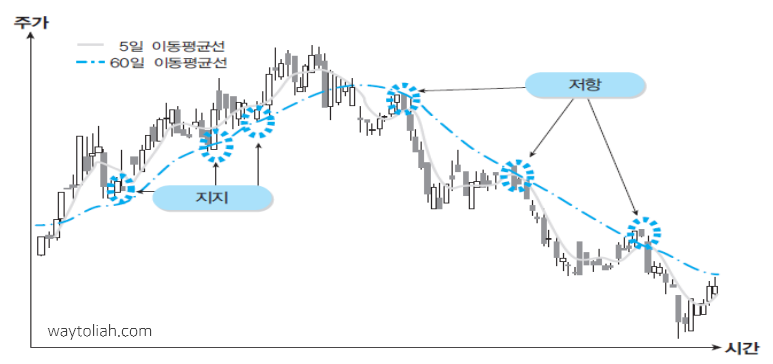 일정 기간 동안의 평균적인 주가 흐름을 확인하고, 이것이 현재 주가의 진행방향과 어떤 관계가 있는지를 분석함으로써 미래의 주가 움직임을 예측하는 방법