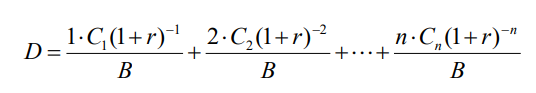 - 채권의 만기일까지 각 기간을, 각 기간에 들어오는 현금흐름의 현재가치가 전체 현금 흐름의 현재가치(채권가격)에서 차지하는 비율로 가중하여 합한 가중 평균만기를 의미함