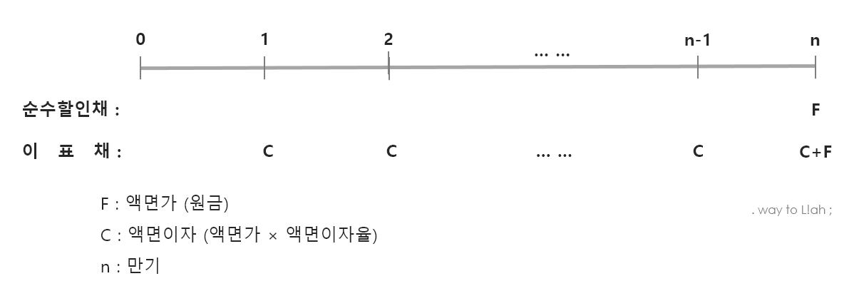 - 이자 지급 방법에 따라 : 이표채(회사채, 국고채 등), 복리채(국민주택 1종, 할인채(1년 미만 통안증권)