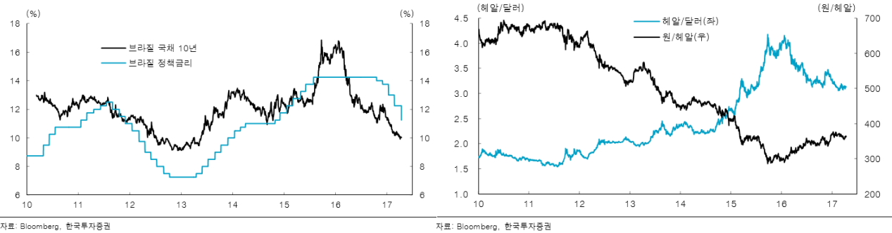- 2016년 초반 16.7%를 상회했던 브라질 국채 10년 금리가 2017년에는 10.1%대