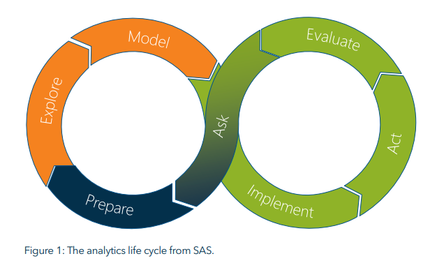 SAS의 모델은 모델의 주기적 특성을 강조하며, life cycle 7단계로 구성되어 있다. 다른 수명주기와 다른 점은, 분석가들이 솔루션을 평가하고 잠재적으로 다시 질문 단계로 돌아갈 수 있도록 설계된 Act(실행) 단계 이후의 Evaluate(평가) 단계를 포함한다는 점이다. (참고)