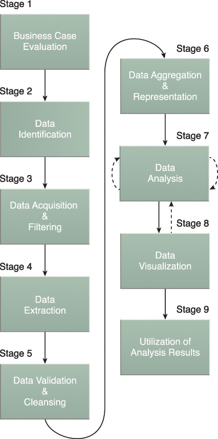 빅 데이터 기본 원리(Big Data Fundamentals: Concepts, Drivers & Techniques) 책에서 제안된 빅데이터 분석 수명주기는 9단계로 앞서 소개한 수명주기보다 3~4단계가 더 많다. 그러나 준비 및 처리 단계를 더 세분화한 것으로, 분석 단계 전에 데이터를 수집, 준비 및 정리하는 데 필요한 개별 작업을 강조한다. (참고)