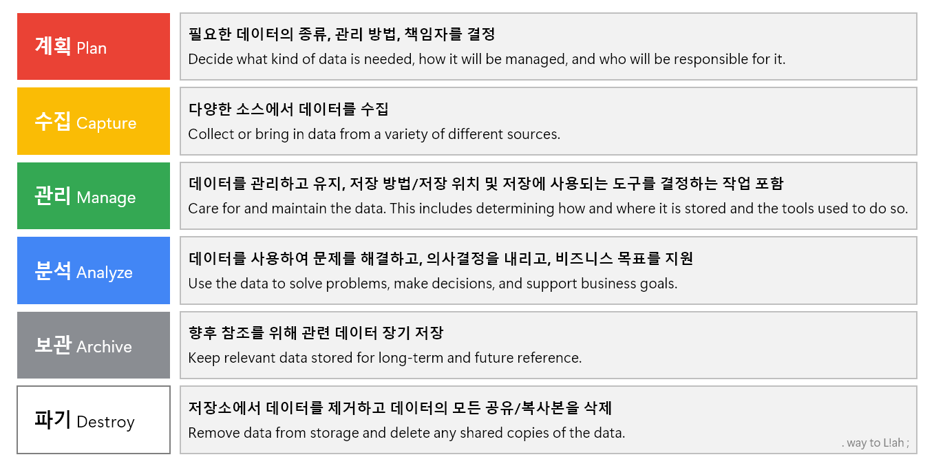 데이터 수명주기(Plan, Capture, Manage, Analyze, Archive, and Destroy)를 데이터 분석 수명주기(Ask, Prepare, Process, Analyze, Share, and Act)와 혼동하지 말것.