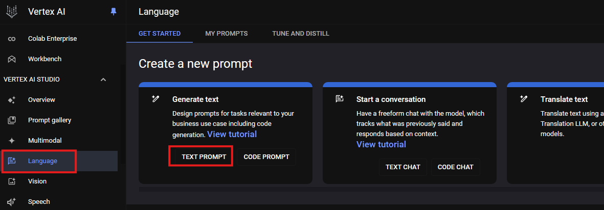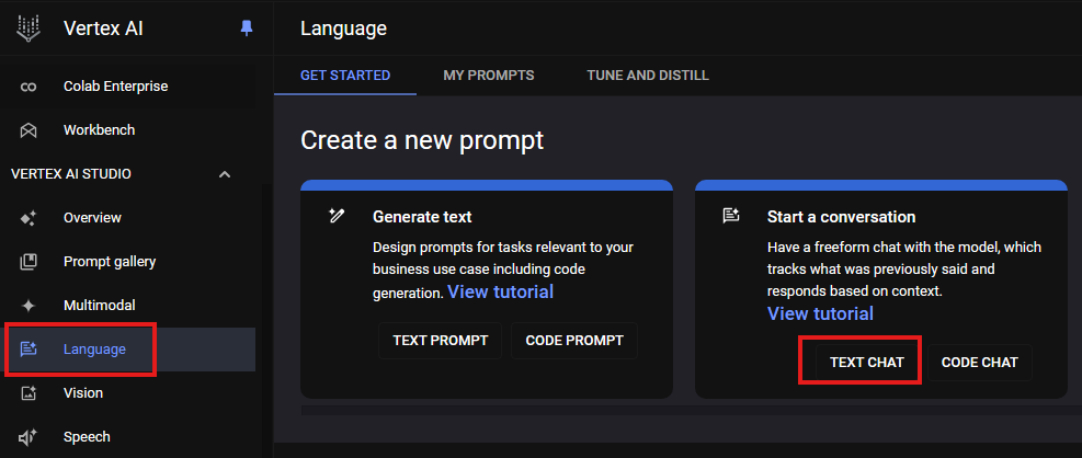 1. Vertex AI Studio > Language > Create a new Prompt > Start a conversation [ TEXT CHAT ] 클릭