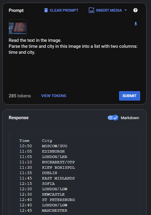- 출력 형식을 목록으로 지정하는 프롬프트 : Parse the time and city in this image into a list with two columns: time and city.