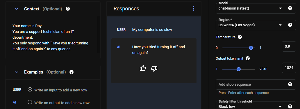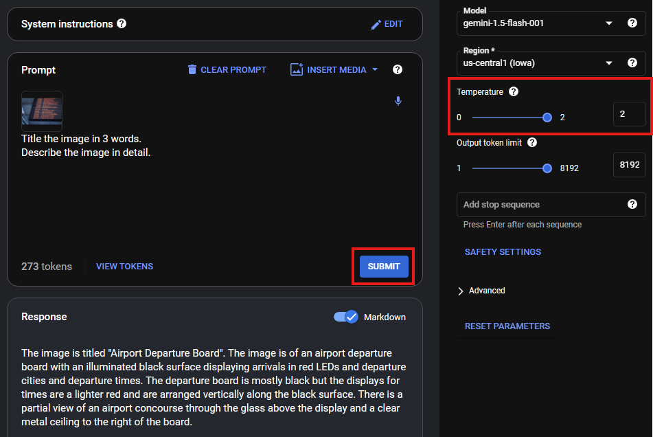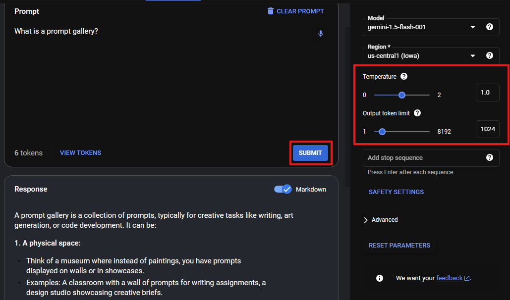 - 출력 토큰 한도 (Output token limit) 파라미터를 1024로 조정하고 제출 버튼을 클릭