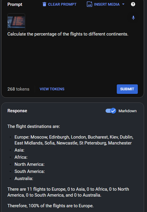 - 프롬프트 : Calculate the percentage of the flights to different continents.