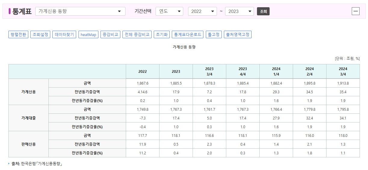 - 한국은행이 발표한 2024년 2분기 가계신용 통계에 따르면, 가계신용 잔액은 1,896.2조 원으로 전 분기 대비 13.8조 원 증가함.