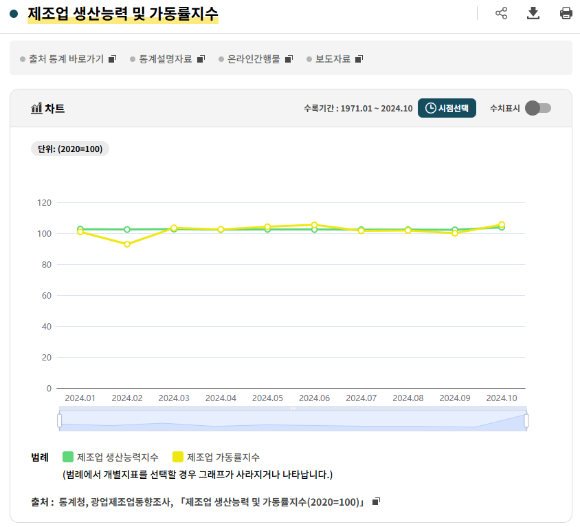 - 의의: 가동률은 경제활동의 강도를 나타내는 중요한 지표로, 설비 투자 결정, 고용 수준, 생산량 계획 등 경제적 의사결정에 큰 영향을 미침