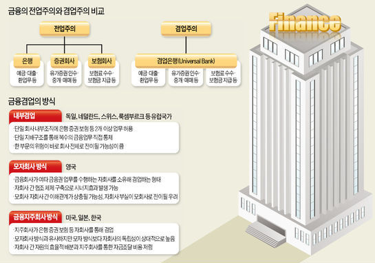 하나의 금융회사가 제공할 수 있는 금융서비스의 종류를 어떻게 정하느냐에 따라 겸업주의(universal banking)와 전업주의(specialized banking)로 구분된다. 겸업주의는 한 금융회사가 은행 증권 보험 등 여러 금융서비스를 취급할 수 있는 반면 전업주의는 은행 증권사 보험사 등이 각각 해당하는 고유의 서비스만을 제공하는 방식이다. 현재 세계적으로 겸업주의가 대세를 이루고 있으나 국가별로는 법적 형태면에서 차이가 있다. 독일, 네덜란드, 스위스 등 대부분의 유럽국가는 은행산업과 증권산업 간에 아무런 장벽을 두지 않고 하나의 은행이라는 법적 조직체 안에서 은행, 증권, 보험 등의 모든 서비스를