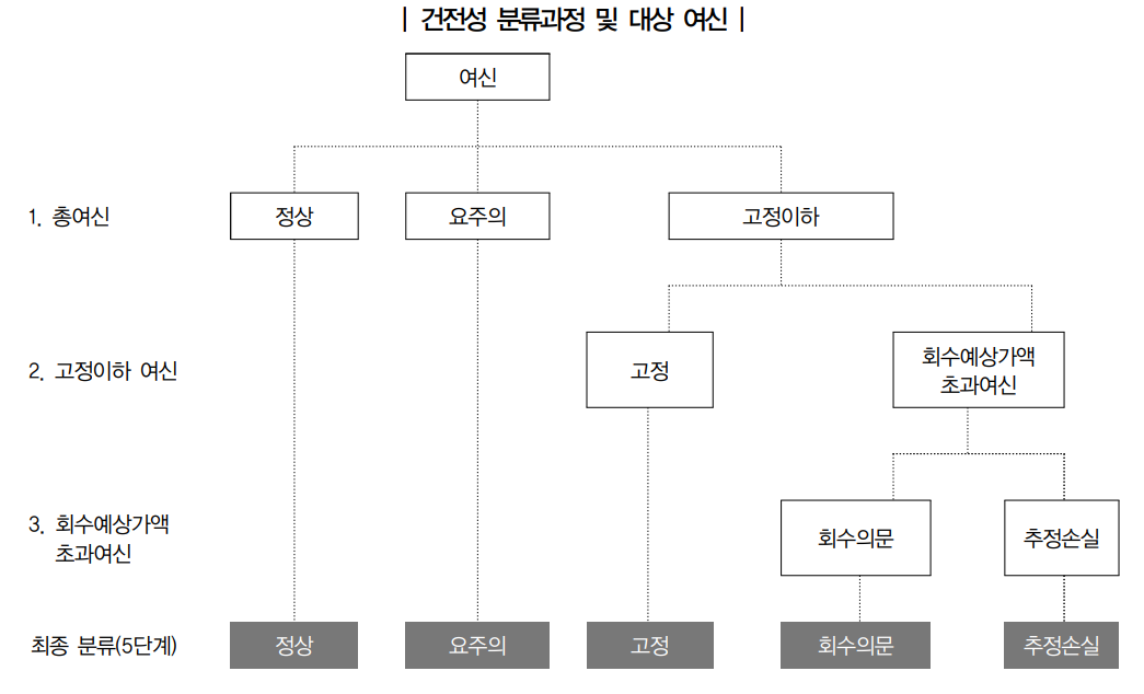 - 충당금 적립: 금융기관은 고정분류여신에 대해 일정 비율의 대손충당금을 적립해야 함. 이는 잠재적 손실에 대비한 재무 건전성을 유지하는 데 목적이 있음.