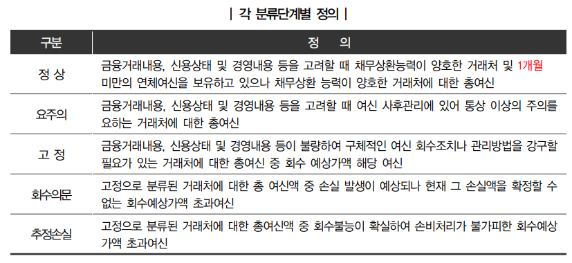 - 연체 기간 기준 : 고정분류여신은 일반적으로 90일 이상 연체된 대출에 해당.